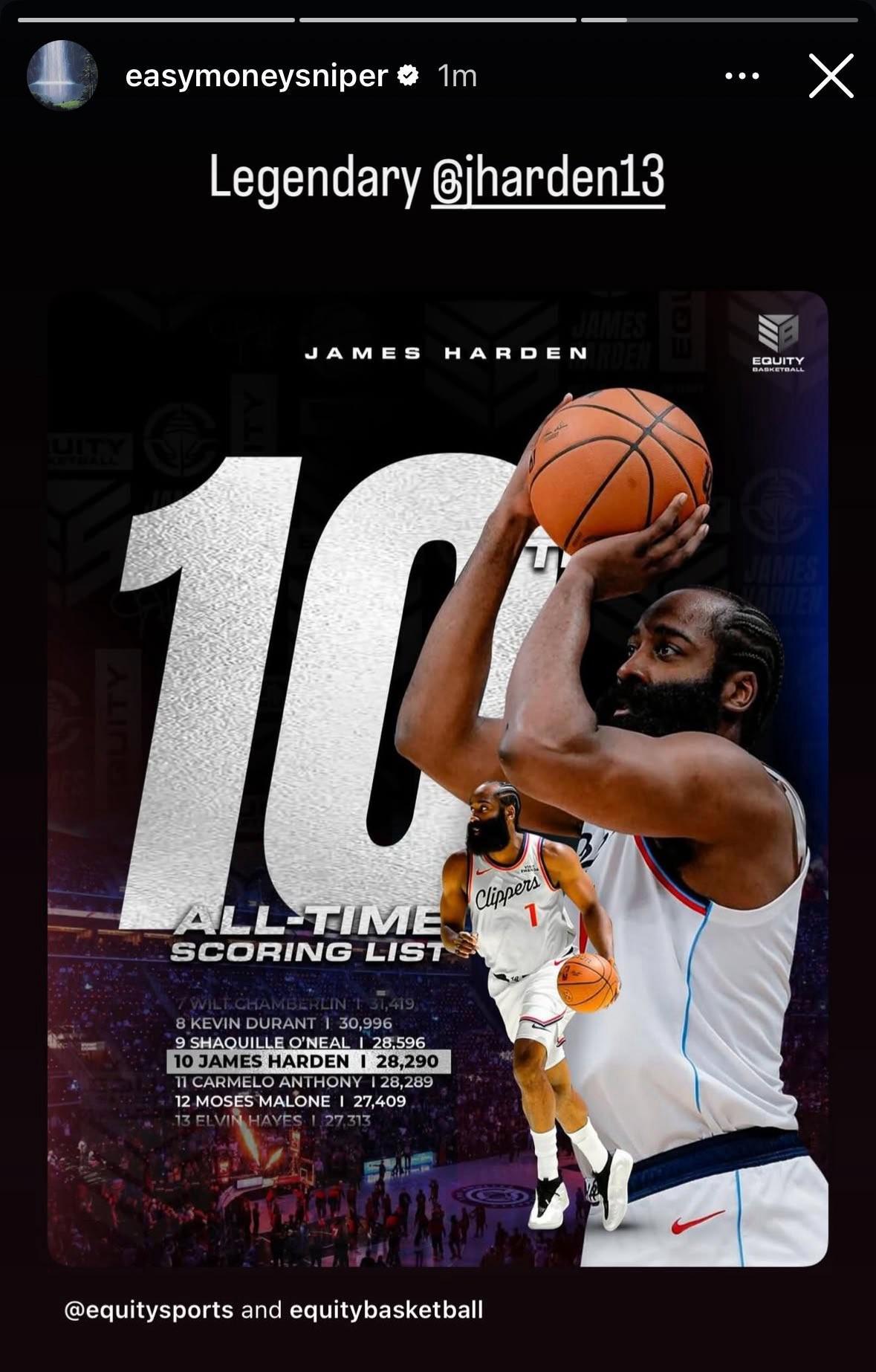 本场比赛,快船球星詹姆斯-哈登惨遭“里程悲”,他通过本场比赛完成对卡梅隆-安东尼的超越,正式升至NBA历史总得分榜的第十位。