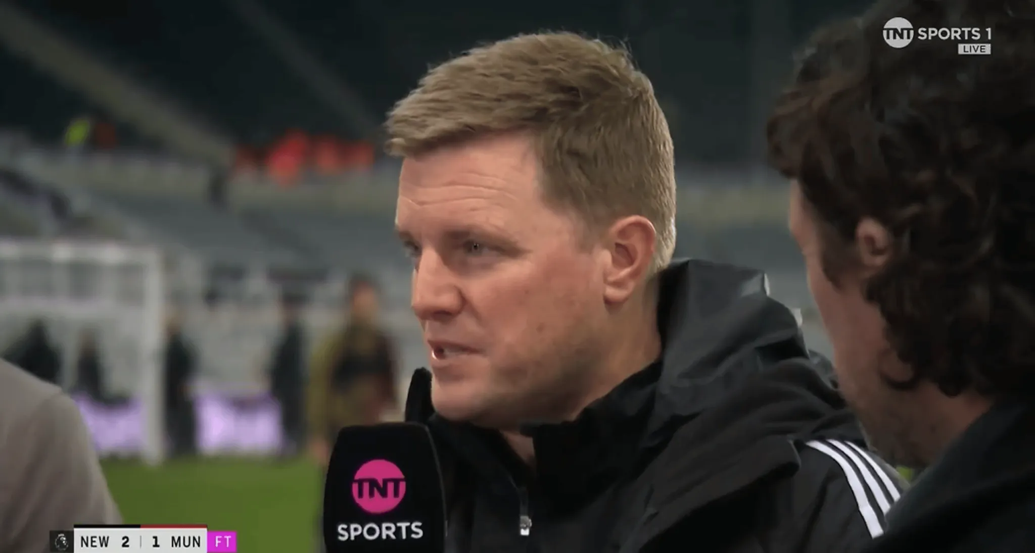 虎扑03月05日讯 纽卡主帅埃迪-豪在本轮英超战胜曼联后接受了媒体TNT体育的采访。